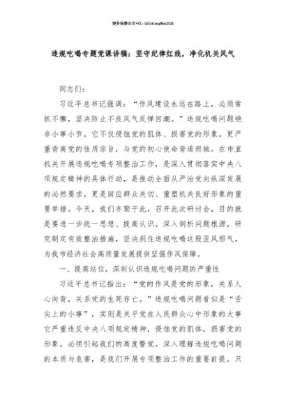 【七哥公文】2025年:【七哥公文】违规吃喝专题党课讲稿:坚守纪律红线,净化机关风气+更多免费公文+VX:QiGeGongWen2024+更多免费公文+VX:QiGeGongWen2024