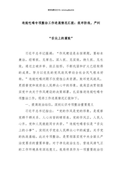 【七哥公文】2025年:【七哥公文】违规吃喝专项整治工作进展情况汇报:筑牢防线,严纠“舌尖上的腐败”+更多免费公文+VX:QiGeGongWen2024+更多免费公文+VX:QiGeGongWen2024