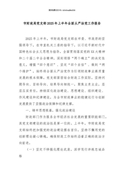 【七哥公文】2025年:【七哥公文】市财政局党支部2025年上半年全面从严治党工作报告+更多免费公文+VX:QiGeGongWen2024+更多免费公文+VX:QiGeGongWen2024