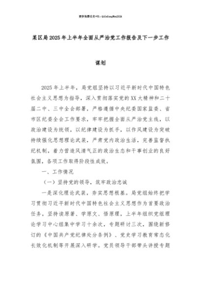 【七哥公文】2025年:【七哥公文】某区局2025年上半年全面从严治党工作报告及下一步工作谋划+更多免费公文+VX:QiGeGongWen2024+更多免费公文+VX:QiGeGongWen2024