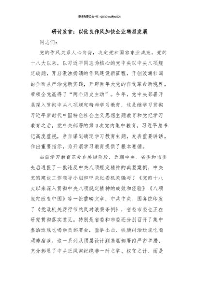 【七哥公文】2025年:【七哥公文】研讨发言:以优良作风加快企业转型发展+更多免费公文+VX:QiGeGongWen2024+更多免费公文+VX:QiGeGongWen2024