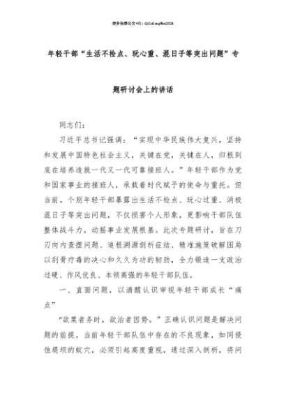 【七哥公文】2025年:【七哥公文】年轻干部“生活不检点、玩心重、混日子等突出问题”专题研讨会上的讲话+更多免费公文+VX:QiGeGongWen2024+更多免费公文+VX:QiGeGongWen2024