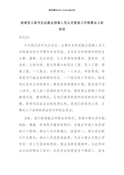 【七哥公文】2025年:【七哥公文】街道党工委书记在就业困难人员认定核查工作部署会上的讲话+更多免费公文+VX:QiGeGongWen2024+更多免费公文+VX:QiGeGongWen2024