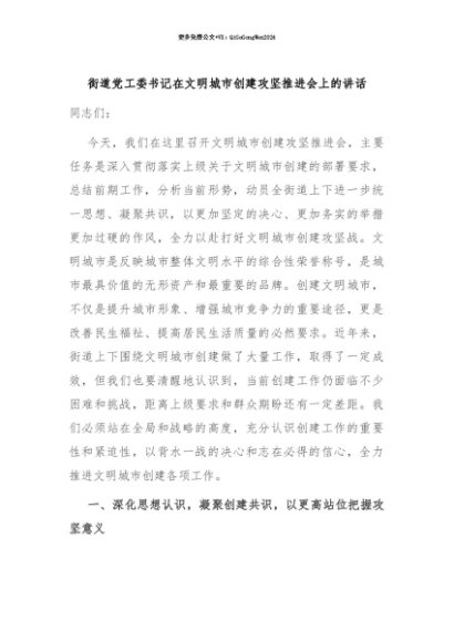 【七哥公文】2025年:【七哥公文】街道党工委书记在文明城市创建攻坚推进会上的讲话+更多免费公文+VX:QiGeGongWen2024+更多免费公文+VX:QiGeGongWen2024