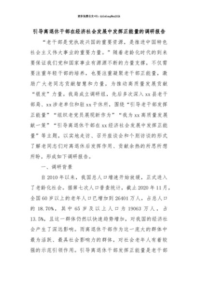 【七哥公文】2025年:【七哥公文】引导离退休干部在经济社会发展中发挥正能量的调研报告+更多免费公文+VX:QiGeGongWen2024+更多免费公文+VX:QiGeGongWen2024