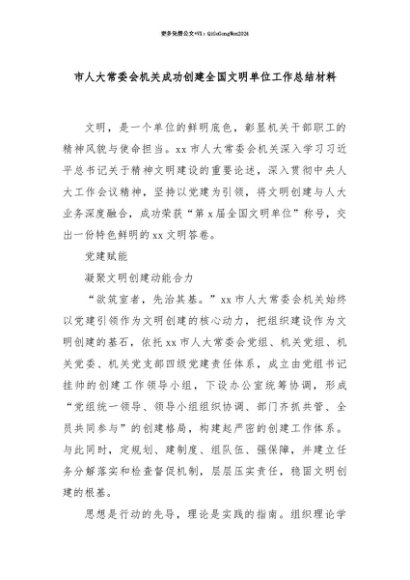 【七哥公文】2025年:【七哥公文】市人大常委会机关成功创建全国文明单位工作总结材料+更多免费公文+VX:QiGeGongWen2024+更多免费公文+VX:QiGeGongWen2024