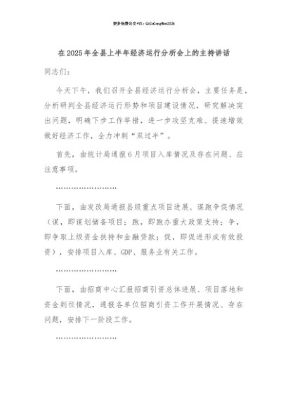 【七哥公文】2025年:【七哥公文】在2025年全县上半年经济运行分析会上的主持讲话+更多免费公文+VX:QiGeGongWen2024+更多免费公文+VX:QiGeGongWen2024