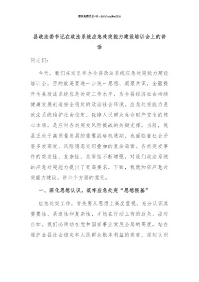 【七哥公文】2025年:【七哥公文】县政法委书记在政法系统应急处突能力建设培训会上的讲话+更多免费公文+VX:QiGeGongWen2024+更多免费公文+VX:QiGeGongWen2024