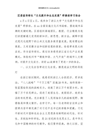 【七哥公文】2025年:【七哥公文】区委宣传部长“文化提升和生态发展”研修班学习体会+更多免费公文+VX:QiGeGongWen2024+更多免费公文+VX:QiGeGongWen2024