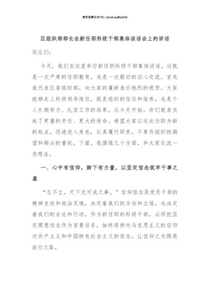【七哥公文】2025年:【七哥公文】区组织部部长在新任职科级干部集体谈话会上的讲话+更多免费公文+VX:QiGeGongWen2024+更多免费公文+VX:QiGeGongWen2024
