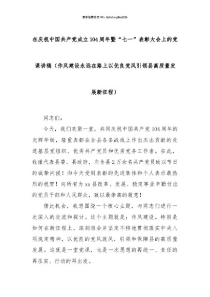 【七哥公文】2025年:【七哥公文】在庆祝中国共产党成立104周年暨“七一”表彰大会上的党课讲稿(作风建设永远在路上以优良党风引领县高质量发展新征程)+更多免费公文+VX:QiGeGongWen2024+更多免费公文+VX:QiGeGongWen2024