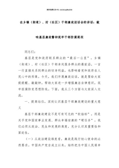 【七哥公文】2025年:【七哥公文】在乡镇(街道)、村(社区)干部廉政谈话会的讲话:敲响基层廉政警钟筑牢干部防腐堤坝+更多免费公文+VX:QiGeGongWen2024+更多免费公文+VX:QiGeGongWen2024