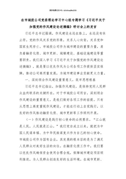 【七哥公文】2025年:【七哥公文】在市城投公司党委理论学习中心组专题学习《习近平关于加强党的作风建设论述摘编》研讨会上的发言+更多免费公文+VX:QiGeGongWen2024+更多免费公文+VX:QiGeGongWen2024