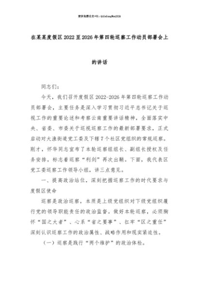【七哥公文】2025年:【七哥公文】在某某度假区2022至2026年第四轮巡察工作动员部署会上的讲话+更多免费公文+VX:QiGeGongWen2024+更多免费公文+VX:QiGeGongWen2024