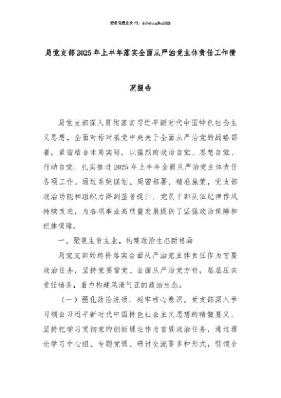 【七哥公文】2025年:【七哥公文】局党支部2025年上半年落实全面从严治党主体责任工作情况报告+更多免费公文+VX:QiGeGongWen2024+更多免费公文+VX:QiGeGongWen2024