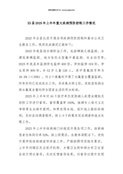 【七哥公文】2025年:【七哥公文】XX县2025年上半年重大疾病预防控制工作情况+更多免费公文+VX:QiGeGongWen2024+更多免费公文+VX:QiGeGongWen2024