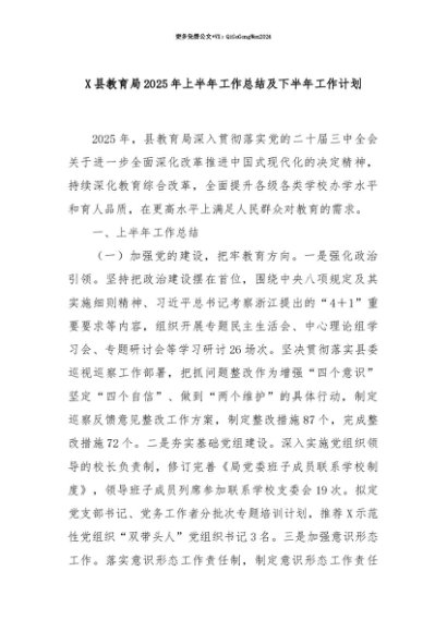【七哥公文】2025年:【七哥公文】X县教育局2025年上半年工作总结及下半年工作计划+更多免费公文+VX:QiGeGongWen2024+更多免费公文+VX:QiGeGongWen2024