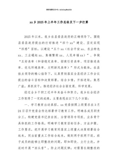 【七哥公文】2025年:【七哥公文】xx乡2025年上半年工作总结及下一步打算+更多免费公文+VX:QiGeGongWen2024+更多免费公文+VX:QiGeGongWen2024
