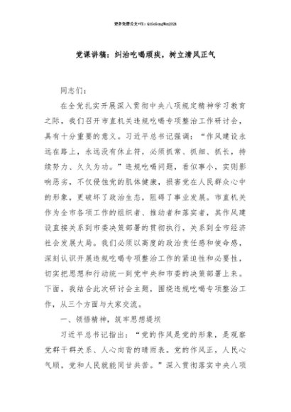 【七哥公文】2025年:【七哥公文】党课讲稿:纠治吃喝顽疾,树立清风正气+更多免费公文+VX:QiGeGongWen2024+更多免费公文+VX:QiGeGongWen2024