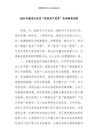 【七哥公文】2025年:【七哥公文】2025年基层公务员“优秀共产党员”先进事迹材料+更多免费公文+VX:QiGeGongWen2024+更多免费公文+VX:QiGeGongWen2024