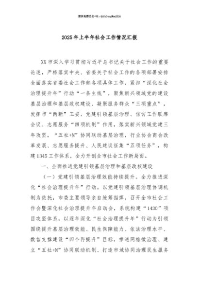 【七哥公文】2025年:【七哥公文】2025年上半年社会工作情况汇报+更多免费公文+VX:QiGeGongWen2024+更多免费公文+VX:QiGeGongWen2024