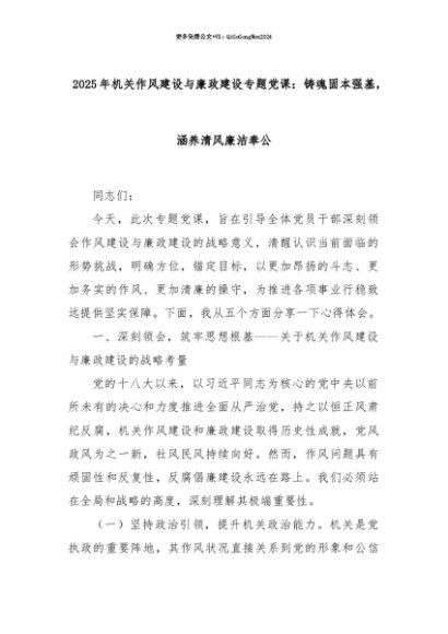 【七哥公文】2025年:【七哥公文】2025年机关作风建设与廉政建设专题党课:铸魂固本强基,涵养清风廉洁奉公+更多免费公文+VX:QiGeGongWen2024+更多免费公文+VX:QiGeGongWen2024