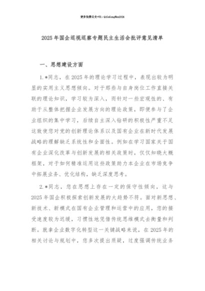 【七哥公文】2025年:【七哥公文】2025年国企巡视巡察专题民主生活会批评意见清单+更多免费公文+VX:QiGeGongWen2024+更多免费公文+VX:QiGeGongWen2024
