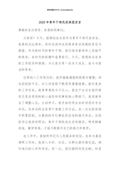 【七哥公文】2025年:【七哥公文】2025年青年干部先进典型发言+更多免费公文+VX:QiGeGongWen2024+更多免费公文+VX:QiGeGongWen2024