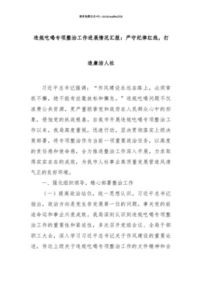 【七哥公文】2025年:【七哥公文】违规吃喝专项整治工作进展情况汇报:严守纪律红线,打造廉洁人社+更多免费公文+VX:QiGeGongWen2024+更多免费公文+VX:QiGeGongWen2024