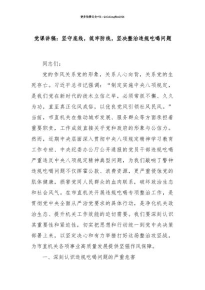 【七哥公文】2025年:【七哥公文】党课讲稿:坚守底线,筑牢防线,坚决整治违规吃喝问题+更多免费公文+VX:QiGeGongWen2024+更多免费公文+VX:QiGeGongWen2024
