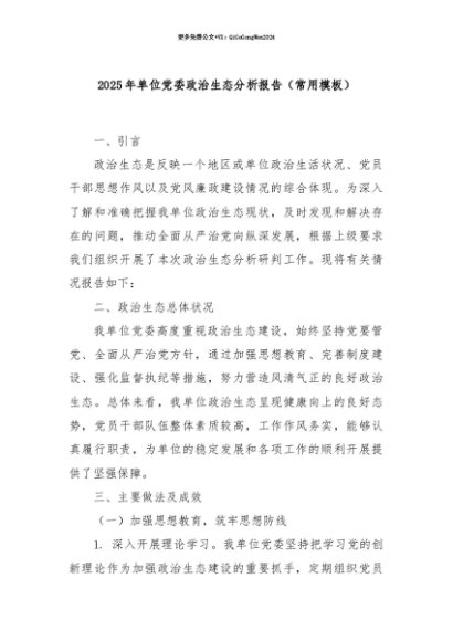 【七哥公文】2025年:【七哥公文】2025年单位党委政治生态分析报告(常用模板)+更多免费公文+VX:QiGeGongWen2024+更多免费公文+VX:QiGeGongWen2024