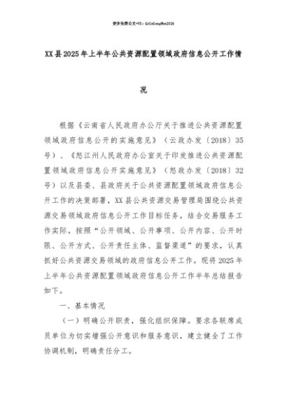 【七哥公文】2025年:【七哥公文】XX县2025年上半年公共资源配置领域政府信息公开工作情况+更多免费公文+VX:QiGeGongWen2024+更多免费公文+VX:QiGeGongWen2024