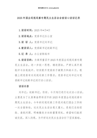 【七哥公文】2025年:【七哥公文】2025年国企巡视巡察专题民主生活会会前谈心谈话记录+更多免费公文+VX:QiGeGongWen2024+更多免费公文+VX:QiGeGongWen2024