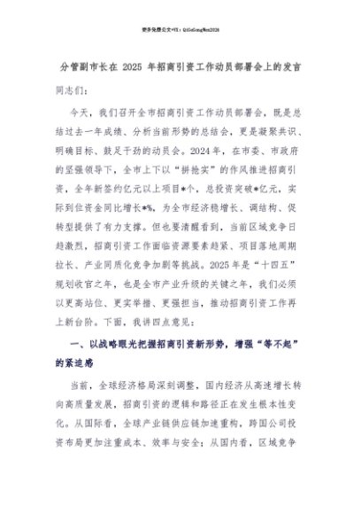 【七哥公文】2025年:【七哥公文】分管副市长在 2025 年招商引资工作动员部署会上的发言+更多免费公文+VX:QiGeGongWen2024+更多免费公文+VX:QiGeGongWen2024