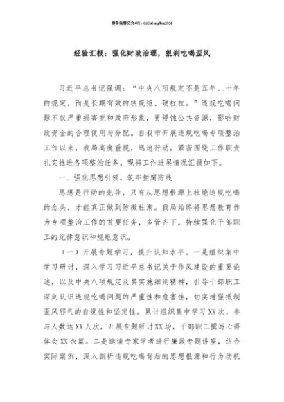 【七哥公文】2025年:【七哥公文】经验汇报:强化财政治理,狠刹吃喝歪风+更多免费公文+VX:QiGeGongWen2024+更多免费公文+VX:QiGeGongWen2024