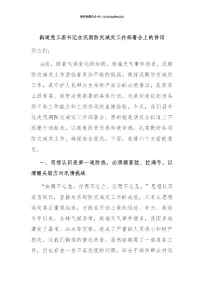 【七哥公文】2025年:【七哥公文】街道党工委书记在汛期防灾减灾工作部署会上的讲话+更多免费公文+VX:QiGeGongWen2024+更多免费公文+VX:QiGeGongWen2024