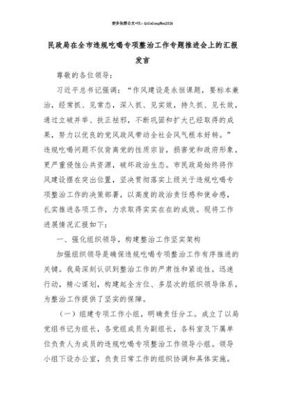 【七哥公文】2025年:【七哥公文】民政局在全市违规吃喝专项整治工作专题推进会上的汇报发言+更多免费公文+VX:QiGeGongWen2024+更多免费公文+VX:QiGeGongWen2024