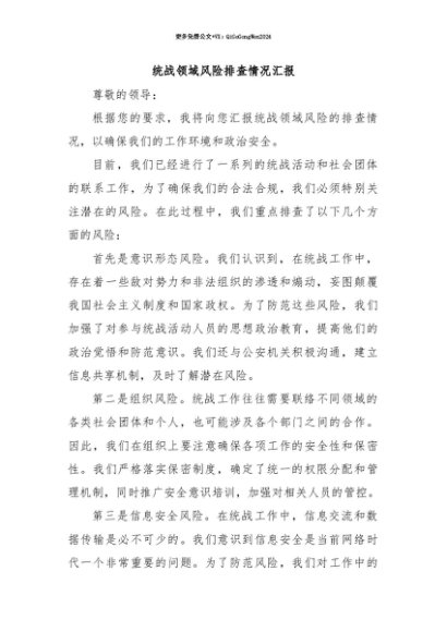 【七哥公文】2025年:【七哥公文】统战领域风险排查情况汇报+更多免费公文+VX:QiGeGongWen2024+更多免费公文+VX:QiGeGongWen2024