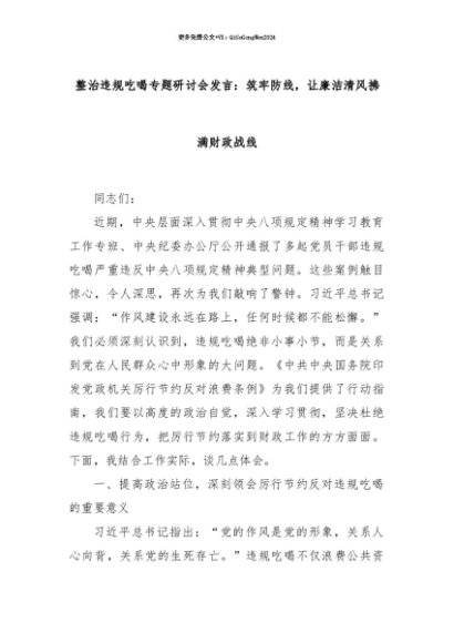 【七哥公文】2025年:【七哥公文】整治违规吃喝专题研讨会发言:筑牢防线,让廉洁清风拂满财政战线+更多免费公文+VX:QiGeGongWen2024+更多免费公文+VX:QiGeGongWen2024