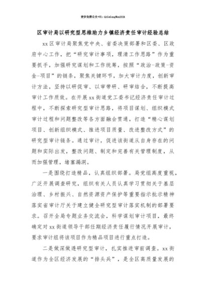 【七哥公文】2025年:【七哥公文】区审计局以研究型思维助力乡镇经济责任审计经验总结+更多免费公文+VX:QiGeGongWen2024+更多免费公文+VX:QiGeGongWen2024