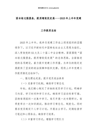 【七哥公文】2025年:【七哥公文】固本培元强堡垒,提质增效促发展——2025年上半年党建工作提质总结+更多免费公文+VX:QiGeGongWen2024+更多免费公文+VX:QiGeGongWen2024