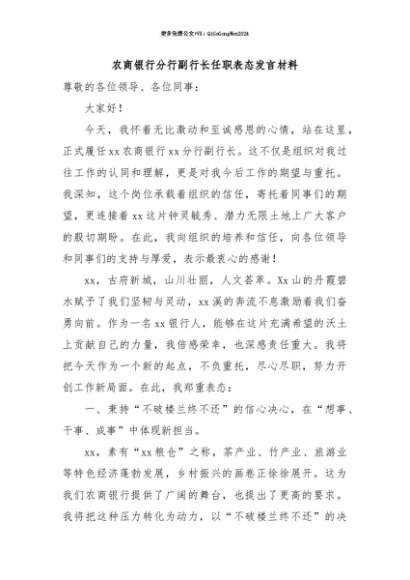 【七哥公文】2025年:【七哥公文】农商银行分行副行长任职表态发言材料+更多免费公文+VX:QiGeGongWen2024+更多免费公文+VX:QiGeGongWen2024