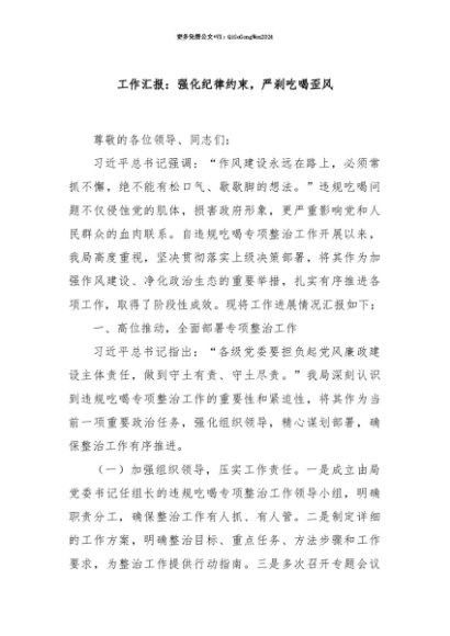 【七哥公文】2025年:【七哥公文】工作汇报:强化纪律约束,严刹吃喝歪风+更多免费公文+VX:QiGeGongWen2024+更多免费公文+VX:QiGeGongWen2024