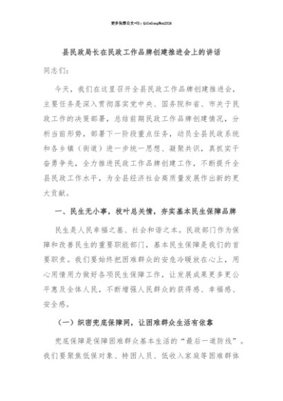 【七哥公文】2025年:【七哥公文】县民政局长在民政工作品牌创建推进会上的讲话+更多免费公文+VX:QiGeGongWen2024+更多免费公文+VX:QiGeGongWen2024