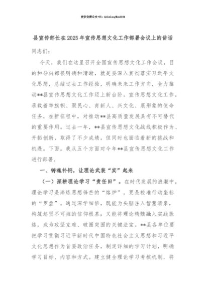 【七哥公文】2025年:【七哥公文】县宣传部长在2025年宣传思想文化工作部署会议上的讲话+更多免费公文+VX:QiGeGongWen2024+更多免费公文+VX:QiGeGongWen2024