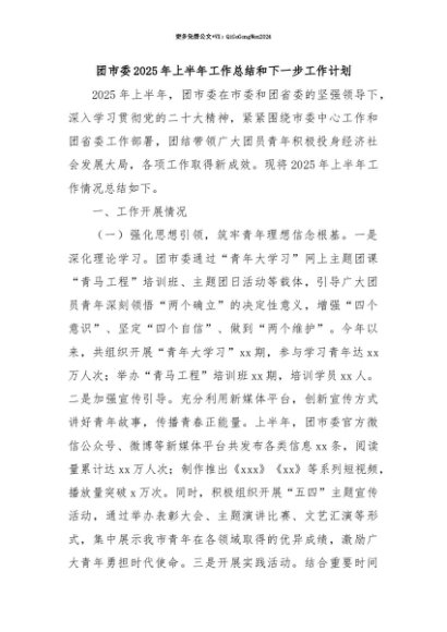 【七哥公文】2025年:【七哥公文】团市委2025年上半年工作总结和下一步工作计划+更多免费公文+VX:QiGeGongWen2024+更多免费公文+VX:QiGeGongWen2024