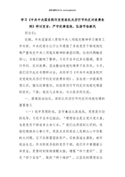 【七哥公文】2025年:【七哥公文】学习《中共中央国务院印发党政机关厉行节约反对浪费条例》研讨发言:严守纪律底线,弘扬节俭新风+更多免费公文+VX:QiGeGongWen2024+更多免费公文+VX:QiGeGongWen2024