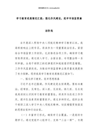 【七哥公文】2025年:【七哥公文】学习教育进展情况汇报:强化作风建设,筑牢市场监管廉洁防线+更多免费公文+VX:QiGeGongWen2024+更多免费公文+VX:QiGeGongWen2024