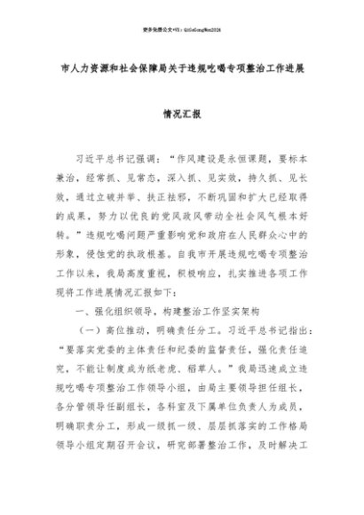 【七哥公文】2025年:【七哥公文】市人力资源和社会保障局关于违规吃喝专项整治工作进展情况汇报+更多免费公文+VX:QiGeGongWen2024+更多免费公文+VX:QiGeGongWen2024