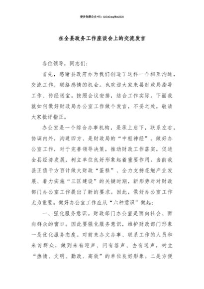【七哥公文】2025年:【七哥公文】在全县政务工作座谈会上的交流发言+更多免费公文+VX:QiGeGongWen2024+更多免费公文+VX:QiGeGongWen2024